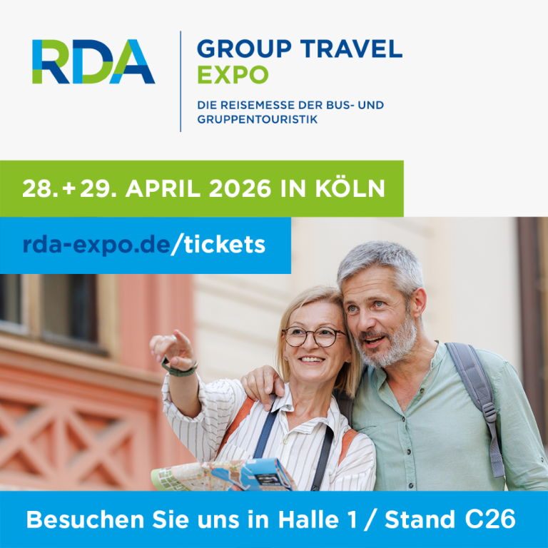 Am 28. und 29. April 2026 sind wir auf der RDA Group Travel Expo in Köln vertreten. Sie finden uns in Halle 1, Stand C26.